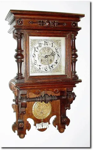 Hands do not match; pendulum top hook missing; no top trim to case. The case was stored in an attic and the glue joints have failed. Still, this clock...