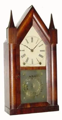 C.1845, Brewster and Ingrahams, Bristol, CT. 8-day striking "Sharp Gothic" or steeple clock in mahogany veneered case.
