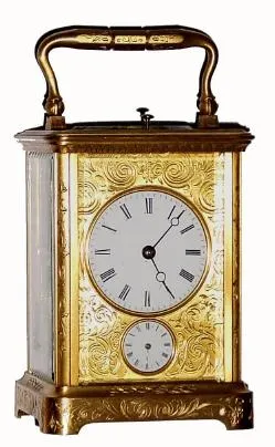 C.1900, French, Paul Garnier (signed on base), Gilt Brass Carriage clock, in an engraved case and in excellent restored condition.