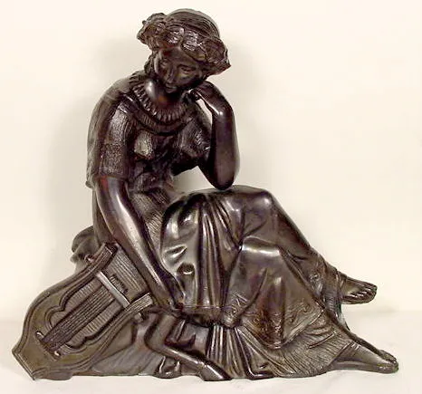 of stylized birds and woman's heads statue clock, figural top of woman with lyre, 19 1/2 inches Tall x 16 inches Wide...