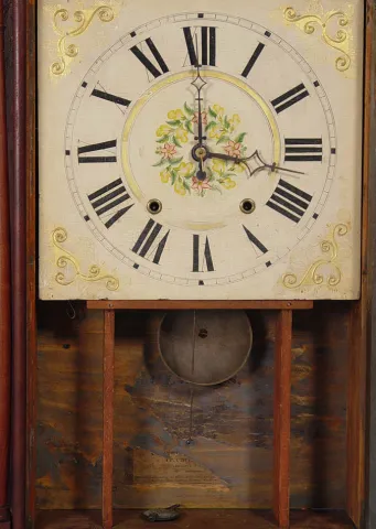 Circa 1830 12 inches gilt and hand painted wood dial, 30-hour, wood works movement, overall good original, but needing some TLC, original reverse glas...