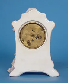 Circa 1900 3 1/2 inches original paper dial, 30-hour, rear wind brass movement, lever escapement with alarm, Victorian china case with hand painted fl...