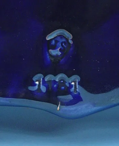Circa 1910 4 inches restored gilt embossed dial, 8-day, brass spring driven movement, lovely cobalt blue pottery case with signed hand painted cartouc...