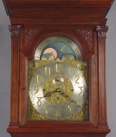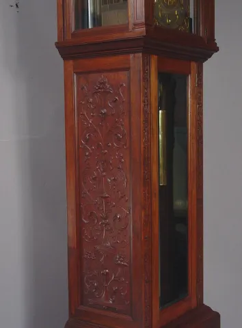 American Tiffany and Co. NY Carved Mahogany Triple Chime Hall Clock,