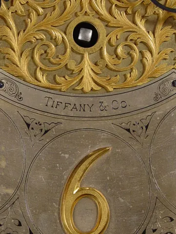 Circa 1910 13 inches brass and silvered dial has an 18 inches arch, is engraved "Tiffany and Co. ", 8-day, high quality brass 9-tube chime movement, m...