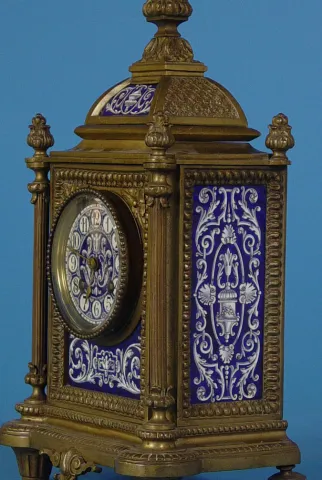 Circa 1880 3 1/2 inches dial is hand painted cobalt blue tile, signed "J.E. Caldwell and Co., Philadelphia", 8-day, circular brass movement, well exec...