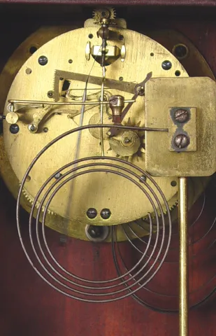 Circa 1920 4 1/4 inches engraved dial, 8-day, brass spring driven movement, detailed brass applied to well made mahogany lantern-style case, a very ni...