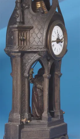 Circa 1880 2 1/4 inches enamel dial, 30-hour, brass pendulette movement, heavy cast metal gothic case, monk rings alarm bell, very good condition. Hei...