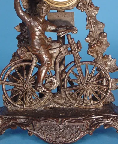Circa 1885 2 1/2 inches white enamel dial, 30-hour, brass lever escapement movement, rare case style inscribed Paris a Drest, depicting ca 1880 bicycl...