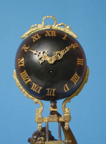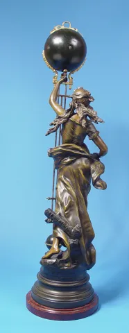 Circa 1915 6 inches ball type dial, with applied bronze numerals, 8-day, brass spring driven movement, statue base has plaque stating "Brise D'Automne...