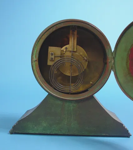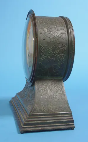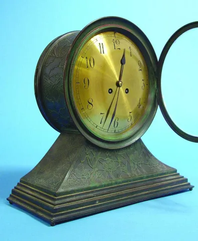 Circa 1910 8 inches spun brass finish dial has wear, 8-day, brass bell strike movement, Art Nouveau tiffany style patinated bronze with ivy vine relie...