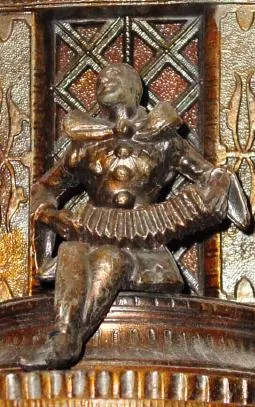 C.1935, Lux Manufacturing Co., Waterbury Conn., "JESTER", Art Deco, patinated white metal clock and lamp.