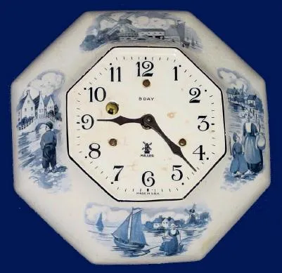 C.1930, Irving Miller & Co., New York, "Holland" model kitchen clock in pattern 508, delft blue.