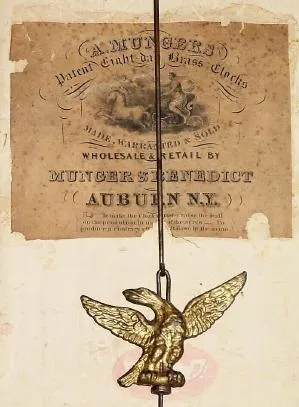 C.1832, Munger & Benedict, Auburn, New York, 8-day time & strike mirror clock. The refinished butternut & mahogany case with carved columns is in very nice condition
