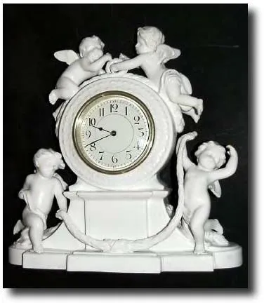C.1910, English, Copeland's SPODE porcelain china clock. We tried photographing this against white and you simply couldn't tell where the clock started or finished, so we put it on a piece of black foam and this was the result. Four winged cherubs at play with rope around a monument. The well made 8-day French movement retains original lever platform intact and is running. Porcelain dial is perfect. See Spode signature (in green). Height 11" Reserve: $385
