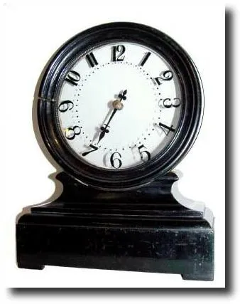 The case and movement are unsigned, however, the lever movement is of high quality. A gear from the movement meshes with the inside glass of the dial causing the single hand to rotate every 12 hours. There was a thin dust ring around the rear bezel to hide the gear and keep dust out of the movement, and that is absent. The case is of ebonized wood, and the bezel has a dry split on the left that has been glued a few times. Still, this is an unusual clock, and can be bought for far less than the models made 100 years earlier. Lighter set of numerals in photo are shadow from the flash going through the dial. Height 11" Reserve $1650