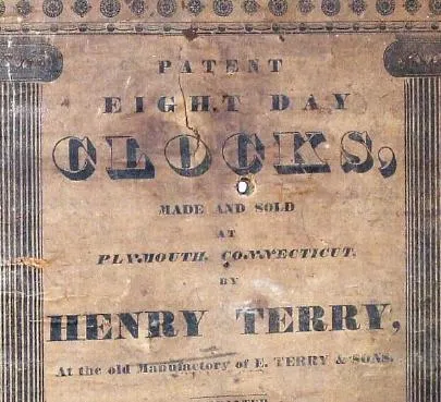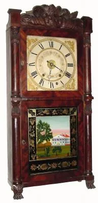 C.1833, Henry Terry, Plymouth, Conn., 8-day time/strike/alarm wood movement, double deck, carved crest shelf clock in very nice condition with an old finish.