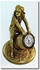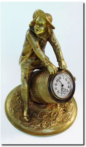 C.1910, French Bronze of a boy in mid pants, knee socks, spats and hat, straddling a wooden slat pickle barrel. The open end of the barrel containing a Swiss one day watch movement, stem wind and set. The detail on this bronze is very good, and captures a no worries look, possibly that of "Huck Finn'. Height 5.5'