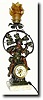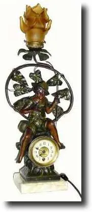 This is a very attractive item, just rewired.. takes small base 110v bulb, included. The time only movement is a mediocre fit-up lever stamped "Made in France", seems to run for less than a day. BUT THE best part is the young lad sitting on a rock, with his first fish in hand. We had a similar clock, less lamp two years ago. Height 24" $300-500