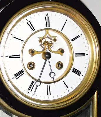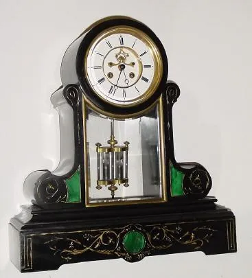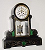C.1890, French, black marble with green malachite inserts mantel clock, 8-day time/strike.