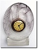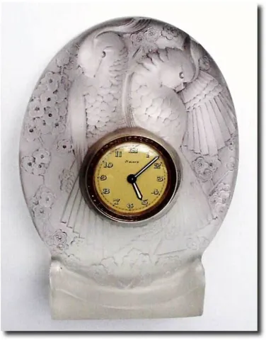 C.1910, French, Glass Desk Clock, with 8-day lever movement, the case is heavy frosted crystal in relief, showing two small parrots or love birds among the flowers. The marked Swiss movement is clean and running; gilt dial; lovely quality. Height 6.7'