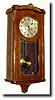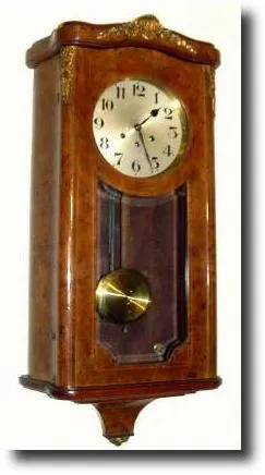 and with quality Gustav Becker movement (original and with unusual stamp - Fabrique Allemain, made by Becker especially for the French clock company). This is a very attractive case with S curve or bombay sides, all with attractive burled walnut veneer, accented at top with ormolu trim, and the door with a piece of heavy beveled glass. Plays Westminster tune on the quarters on straight steel rods. Original silvered dial with minor tarnishing and orig hands. Runs but would benefit from service; the case with a dozen or so wood worm holes. Height 33" Reserve $400