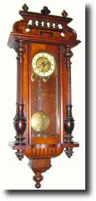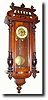 in a walnut case with an earlier top (looks OK). The brass dial center has Art Nouveau designs, and the pendulum is embossed with a lovely Nouveau lad...