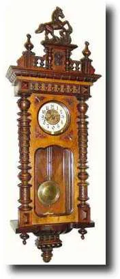 8-day spring, in a heavy full size case with large round columns on each side, and surmounted by the original top with original horse. There are minor...