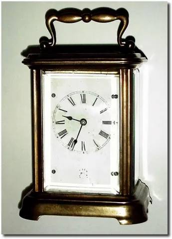 C.1910, Jennings Bros. (Conn. and Illinois) time only carriage clock in generally good original condition.