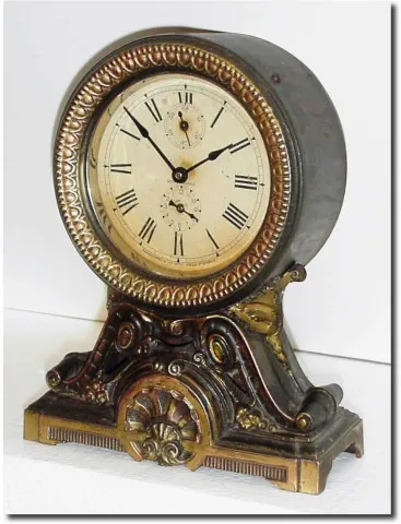 C.1910, Seth Thomas "Long Alarm', the top a pressed brass canister and the base of spelter with antique finish.