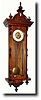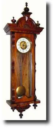 C.1910, Swiss, Quarter Striking wall regulator in the alt Deutsch style, in a well figured walnut and rosewood case. The movement is dirty, but is well made in the usual Swiss manner. Note unusual door style with grooved s-curve splats at 45_. The dial has light blue Arabic numerals on a good porcelain chapter ring with no chips nor cracks. The pendulum has a couple of small dents; note imitation gridiron rod. Minor nicks and scrapes to case, but the clock is in overall very good original condition. Strikes on straight steel rods. If you want a good looking spring regulator, this might be the one. Note original label in base, + original key. Height 54" $600-900