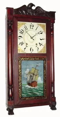 C.1835 Seth Thomas, 30-hour time/strike wood movement carved eagle half column and splat shelf clock