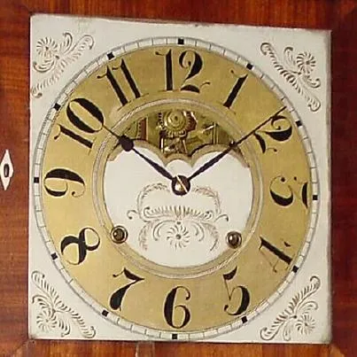 Condition: Partially refinished mahogany veneered case with veneer repairs and chips and some losses. Original dial with white background repainted (c...