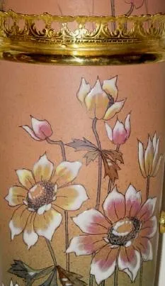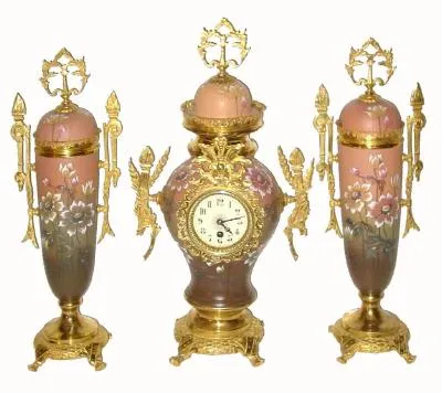 C.1890, French, 3-Pc Porcelain China and ormolu, clock set (time only), hand enameled flowers.