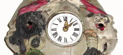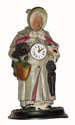 C.1870, Austrian, Meyers, Double Dog animated clock, old lady holding two dogs in her arms, with a THIRD dog barking at her feet.