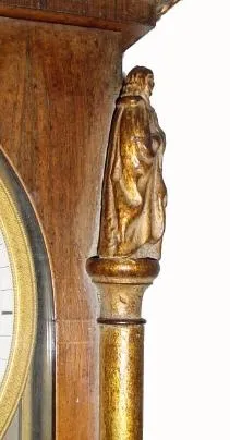 C.1840, Austrian ?Biedermeier?, 3-Wt Grand Sonnerie wall clock in a slender case with small smooth corner columns, each with a small robed figure at the top.