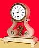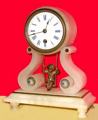 C.1890, French, ?Swinging Doll?, mantel clock, white alabaster case with ormolu waist trim and embossed button accents.