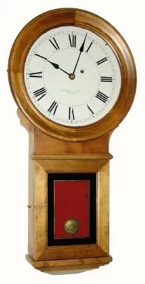 C.1905, Waterbury Clock Co., "Regulator No. 69", in mahogany, with Graham dead beat escapement, wide rod lyre pendulum and music scroll hands.