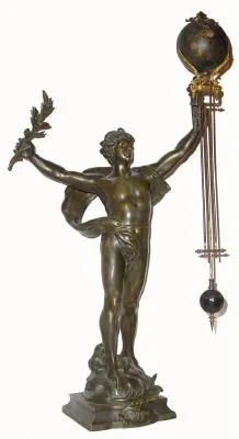 C.1890, French, Bronzed Spelter Swinging arm clock, title ?Le Triomphe? or The Triumph cast into the base of the stataue.