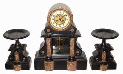 C.1900, French, 3-Piece Mantel set, black marble with contrasting rose colored onyx, with open brocot escapement with ruby red pallets.