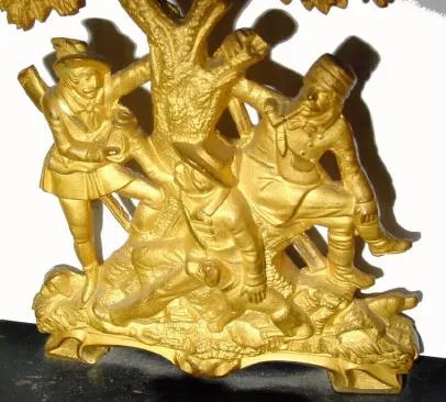 Condition: The ormolu casting of 3 hunters with muzzle loaders, and their 3 retrievers, chatting under a tree, is GREAT with original gilding intact. ...