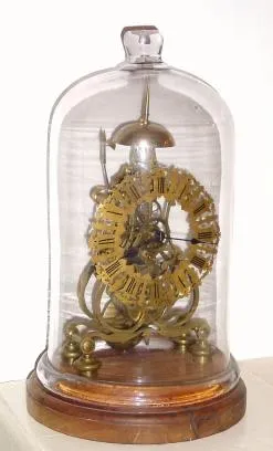 Condition: This clock has a replaced base, made to fit the laboratory bell jar used as a dome. The tuned feet are sunk into the base a half inch, so t...