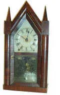 19 inches tall mahogany veneered case; a few chips were repaired; good condition for the age, old glass, lower frosted glass is excel-lent. Door lock...