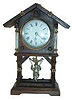 Overall has a Swiss chalet look, corners are metal with rivets, small pieces of metal and rivets applied all around case. 3.5 inch dia. porcelain dia...
