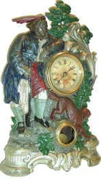 Cast iron shelf clock, 19 inches tall x 13 inches wide. Case depicts man wearing kilt and holding gun with running dog. Brass glass door at bottom sh...