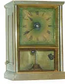 Paneled sides and top, small 1.5 inch square dial. 3 inches tall x 2 inches wide. Glass on bottom shows pendulum 30 hour time only pendulum movement, ...