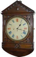 Solid mahogany case is 35 inches high, 20 inches wide, with a steeple roof, scalloped trim below, applied carvings around the bezel, a tapered base w...