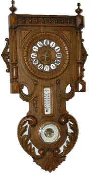 French balcony clock with a barometer, thermometer, and 8 day movement.