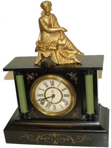 Waterbury Clock Co. enameled iron case clock with figure, "Palmetto", ca 1891.