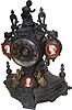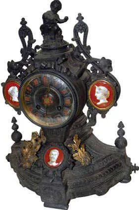 French metal clock, statue of boy and dog on top and portraits of 3 famous people.